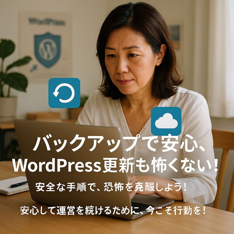WordPress更新の通知を見るたびに胃が痛くなる。あなたも3ヶ月前から更新を先延ばしにして、「いつかサイトが壊れてしまうのでは」という不安で夜も眠れない日があるかもしれません。 特に個人事業主にとって、サイトはまさに生命線。クライアントとの信頼関係や収入に直結するため、「更新して何かあったらどうしよう」という恐怖が更新を阻んでしまうのは当然です。しかし、セキュリティ警告が頻繁に表示される今の状況こそ、実は一番危険な状態なのです。 でも安心してください。正しいバックアップ手順さえ身につければ、WordPress更新の恐怖は完全に解消できます。 この記事では、ITスキルに自信がない方でも確実に実践できる安全なバックアップ方法と更新手順を、具体的なステップで解説します。明日からあなたも更新通知を見て「大丈夫、準備は万全」と思えるようになるでしょう。