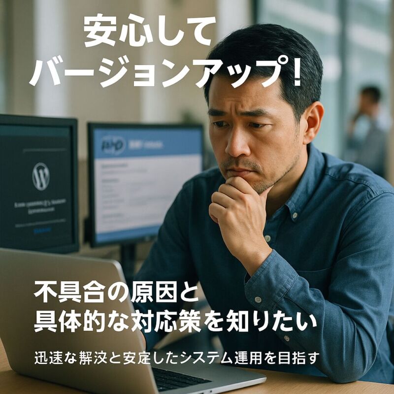 PHPバージョンアップの警告を受けたものの、同僚のサイト破損事例が頭をよぎり「失敗したら会社に損害を与えてしまう」と不安で踏み切れずにいませんか? セキュリティリスクを放置できない一方で、アップデート失敗による責任への恐怖から先延ばししてしまう気持ち、痛いほど理解できます。技術知識に不安があるIT担当者ほど、この判断の重圧は計り知れません。 しかし、適切な手順と対策があれば、PHPバージョンアップは決して恐れる作業ではありません。 実際に数十件のPHPアップデート失敗を解決してきた経験から、失敗する企業には明確な共通点があり、それを事前に把握すれば9割のトラブルは回避できます。この記事では、3時間でサービス復旧を実現した実践的な対応術と、次回更新で絶対に失敗しない安全な準備方法を具体的にお伝えします。