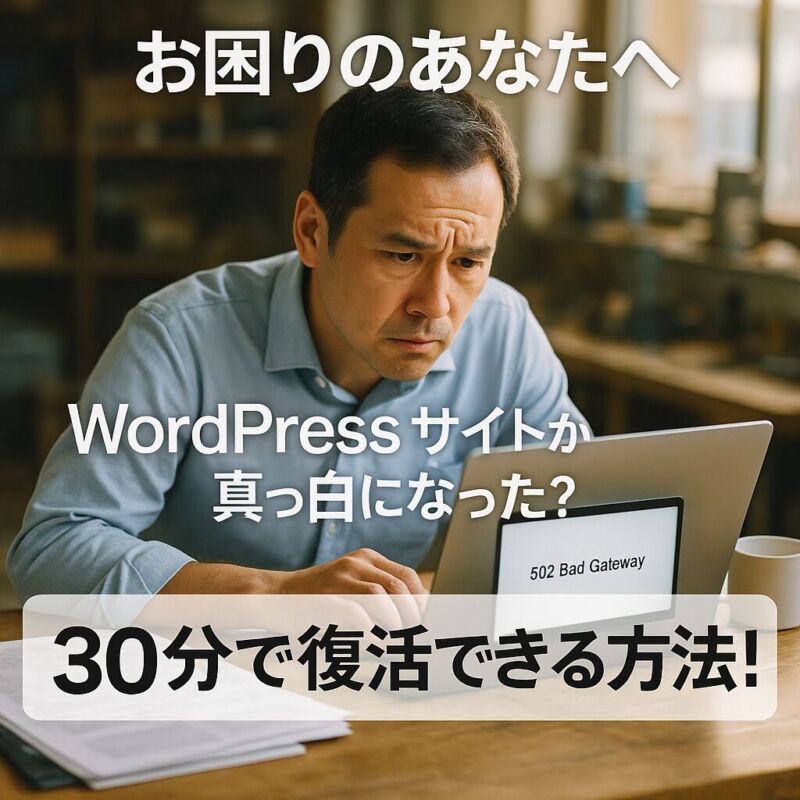 昨夜プラグイン更新後にサイトが真っ白になり、今朝から新規問い合わせが皆無という状況に陥っていませんか? 月末の受注目標達成まで時間がない中、下手に触ってデータが完全に消失するリスクを考えると、何も手を付けられない恐怖感に支配されているはずです。過去にも似たトラブルで半日サイトを止めた経験があると、もう自分だけでの運営に限界を感じてしまうのも当然でしょう。 しかし、WordPressの真っ白エラーは原因が特定可能で、必ず復旧できる問題です。実際に数え切れないサイト復旧を手がけてきた現場経験から断言できます。 この記事では、ITに疎い経営者でも30分以内にサイトを完全復活させる段階的手順を、データ消失リスクを完全回避しながら実行する方法をお伝えします。プラグイン競合の安全な特定方法から、PHPバージョン問題の即座修正まで、今日中の復旧を実現する具体的アプローチを網羅しています。 まずは絶望感から抜け出し、確実な復旧への道筋を一緒に歩んでいきましょう。